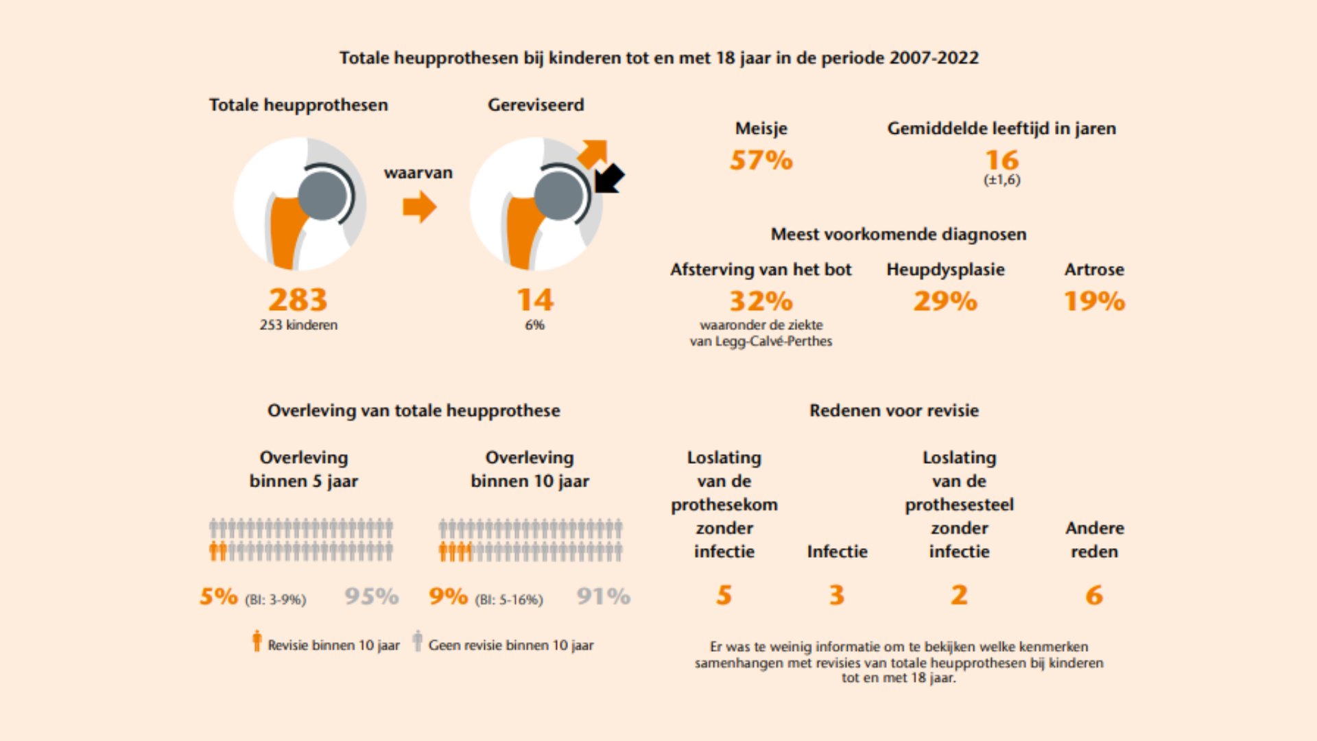 Totale heupprothesen werken goed op korte en middellange termijn bij kinderen tot en met 18 jaar, met een overleving van de prothese die vergelijkbaar is met die van volwassenen. Dit is de grootste studie tot nu toe die de resultaten van deze prothesen bij kinderen tot en met 18 jaar beschrijft. Hoewel er meer onderzoek nodig is om de langetermijnresultaten en mogelijke risico’s beter te begrijpen, wijzen onze resultaten erop dat een totale heupprothese een effectieve behandeling kan zijn voor kinderen met ernstige en invaliderende heupaandoeningen, waarvoor geen andere behandeling mogelijk is.