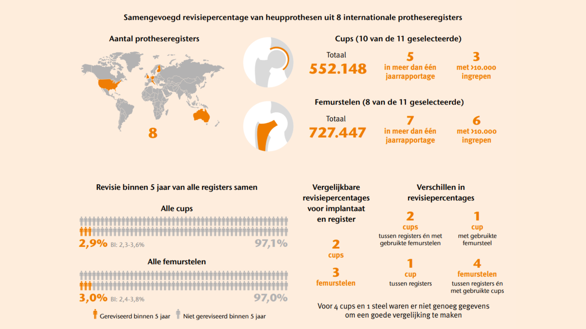 Jaarrapportages van protheseregisters bieden waardevolle, openbare informatie over revisiepercentages van specifieke implantaten. Deze gegevens maken het mogelijk om de resultaten van implantaten in de tijd te volgen en een beeld te krijgen van de kwaliteit. De gebruikte analysemethode, waarbij gegevens uit verschillende registers zijn samengevoegd en vergeleken, is veelbelovend om implantaten te identificeren die in meerdere registers consequent een laag of juist hoog risico op revisie laten zien.