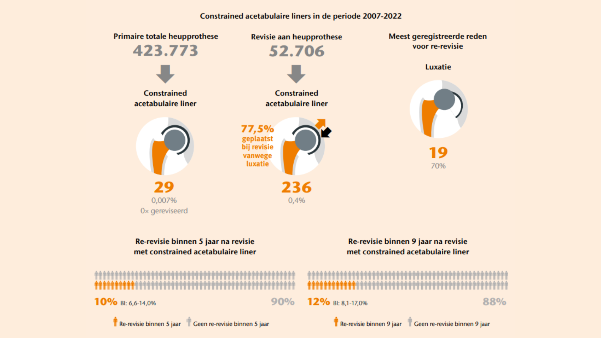 Constrained acetabulaire liners worden in Nederland weinig gebruikt. Dat geldt zowel bij primaire heupprotheseingrepen als bij revisie-ingrepen aan een heupprothese. De overleving van constrained acetabulaire liners lijkt in deze doelgroep, met een hoog risico op luxatie, acceptabel. Een terugkerende luxatie door falen van het constrained mechanisme is daarbij toch de meest voorkomende reden voor een re revisie. Daarom is het aan te raden deze liners alleen te gebruiken bij oudere patiënten, die de prothese weinig belasten, met een hoog risico op luxatie.