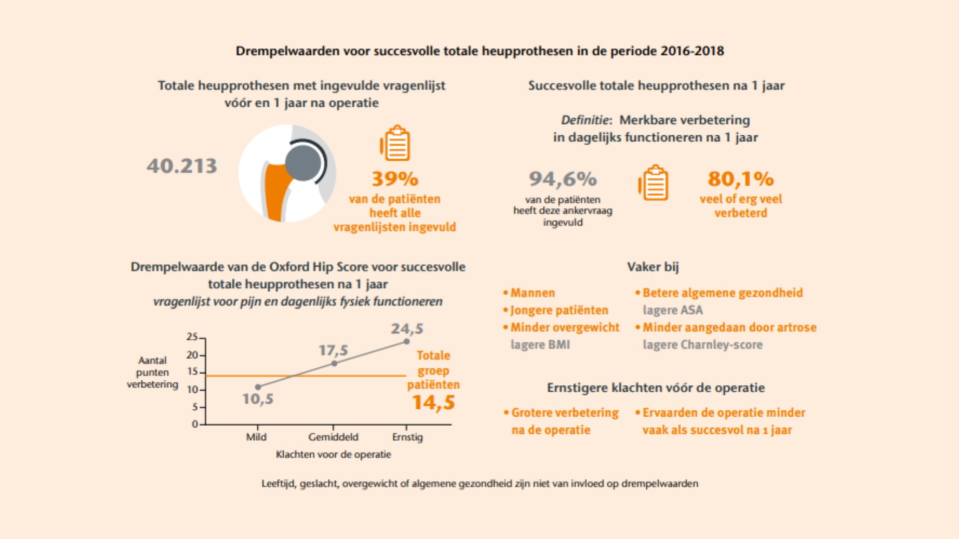 In deze studie zijn drempelwaarden bepaald om succes en tevredenheid na een totale heupprothese te kunnen voorspellen. Patiënten met ernstigere klachten vóór de operatie bleken een grotere verbetering van klachten te moeten behalen om na een totale heupprothese tevreden te zijn. Gedefinieerde drempelwaarden zijn bruikbaar in de spreekkamer wanneer met samen beslissen een totale heupprothese wordt besproken. De drempelwaarden helpen bij het geven van een realistisch beeld over wat iemand na een totale heupprothese kan verwachten.