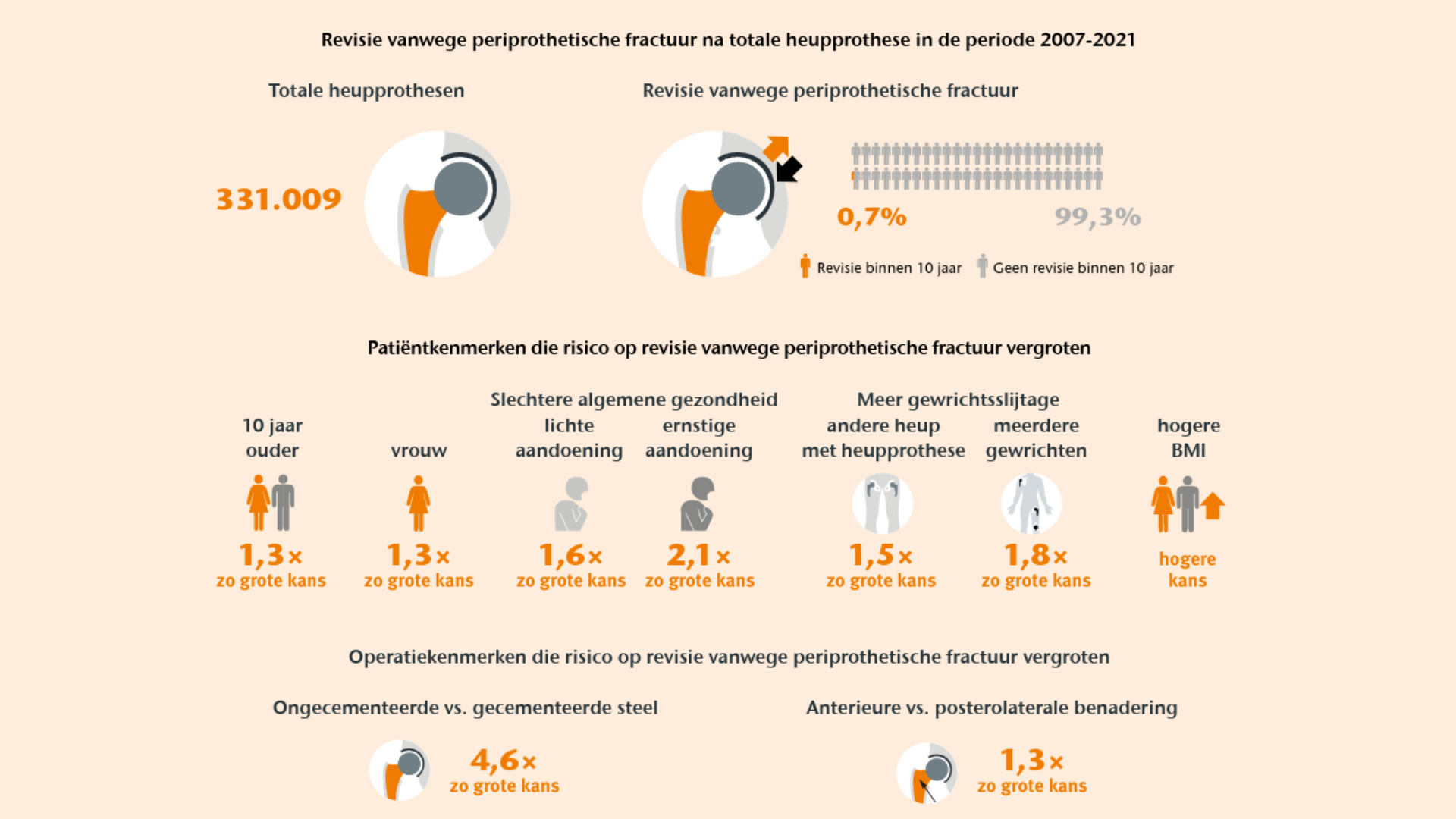 Revisie van de femurcomponent na een totale heupprothese door een periprothetische fractuur komt relatief weinig voor, maar het risico is duidelijk hoger bij oudere, kwetsbaren patiënten. De keuze voor een ongecementeerde steel en een anterieure benadering vergroten dit risico. Omdat deze fracturen vooral bij kwetsbare patiënten voorkomen is niet alleen aandacht voor de techniek belangrijk, maar ook een patiëntgerichte aanpak – vergelijkbaar met de zorg voor kwetsbare ouderen met een gebroken heup. Multidisciplinaire zorg, afgestemd op de kwetsbare populatie, is hierbij essentieel. Verder onderzoek naar alle operatief behandelde periprothetische fracturen is nodig om het volledige klinische beeld te begrijpen.