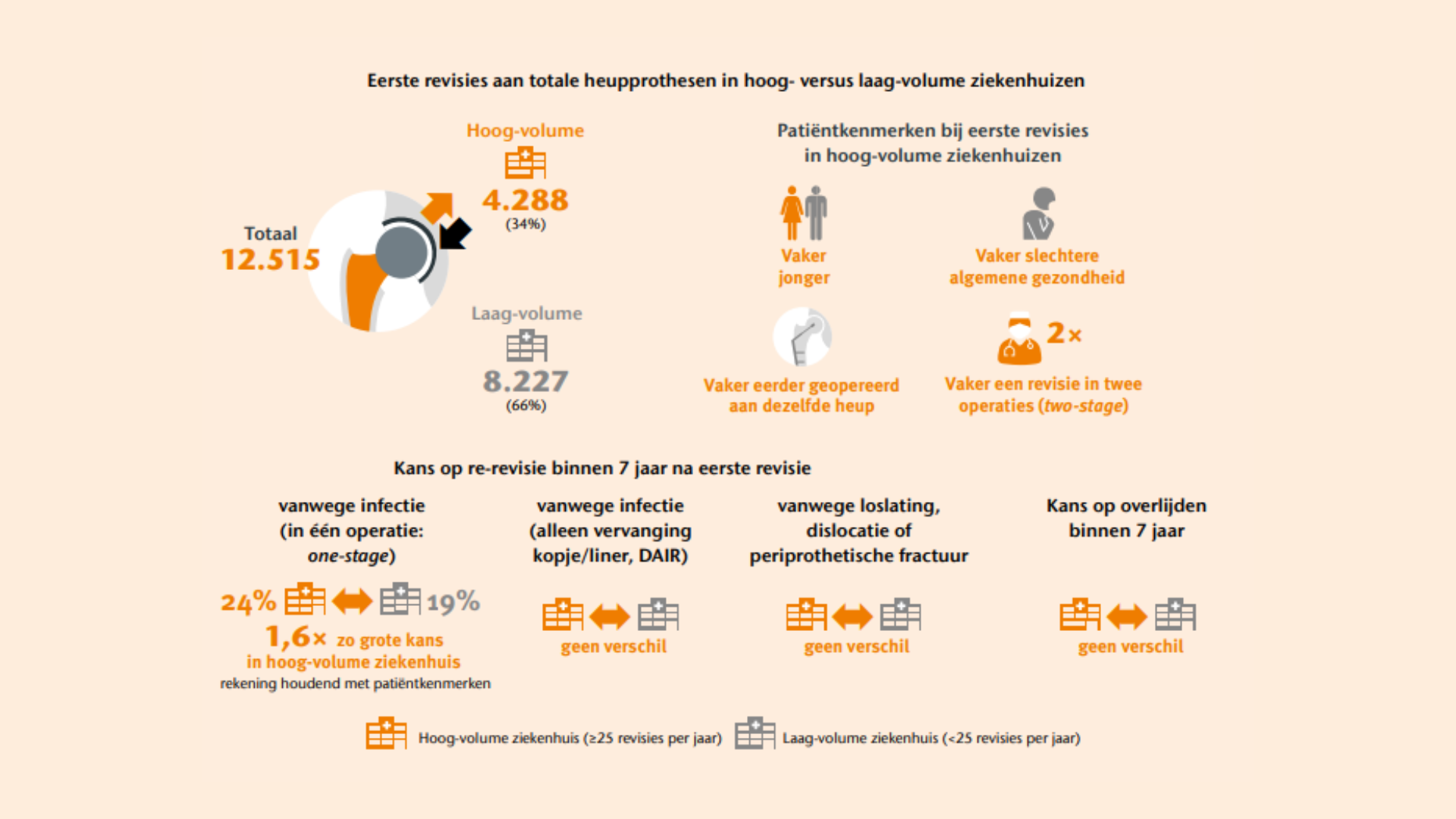 Ziekenhuizen die veel heupprothese revisies uitvoeren hebben over het algemeen geen betere resultaten dan ziekenhuizen met minder eerste revisies. Bij eerste revisies om een andere reden dan infectie – zoals loslating, dislocatie of periprothetische fractuur – is de kans op een re-revisie vergelijkbaar. Bij revisies vanwege infectie (in één operatie; one-stage) is dat risico juist hoger in ziekenhuizen die veel revisies uitvoeren. In deze ziekenhuizen worden ook vaker revisies in twee stappen (two-stage) uitgevoerd. Dit wordt meest waarschijnlijk veroorzaakt door een meer complexe patiëntpopulatie en regionale verwijsafspraken voor complexe infectieproblematiek. Op basis van deze resultaten is er geen bewijs voor het instellen van een volumenorm (verplicht minimumaantal revisies).