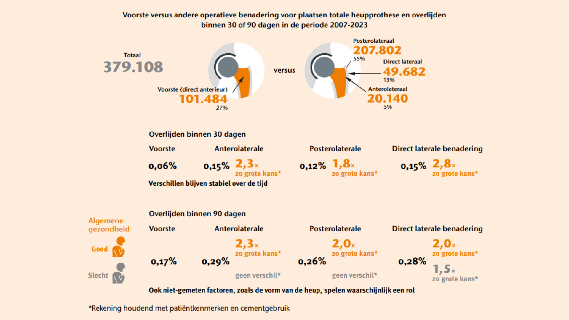 De kans op overlijden binnen 90 dagen na een totale heupprothese is laag. De voorste (of direct anterieure) benadering lijkt samen te gaan met een nog lagere sterfte binnen 30 en 90 dagen, vooral bij patiënten in goede algemene gezondheid. Mogelijk kan dit verklaard worden doordat de voorste benadering minder ingrijpend is, waardoor patiënten sneller mobiel zijn en minder complicaties hebben. Een deel van het verschil kan echter komen door patiëntselectie, omdat patiënten met een complexere heupanatomie of een slechtere gezondheid vaak een andere benadering krijgen. Dit maakt de operatieve benadering, passend bij de gezondheidstoestand van de patiënt, een belangrijk aandachtspunt bij het plannen van een totale heupprothese.