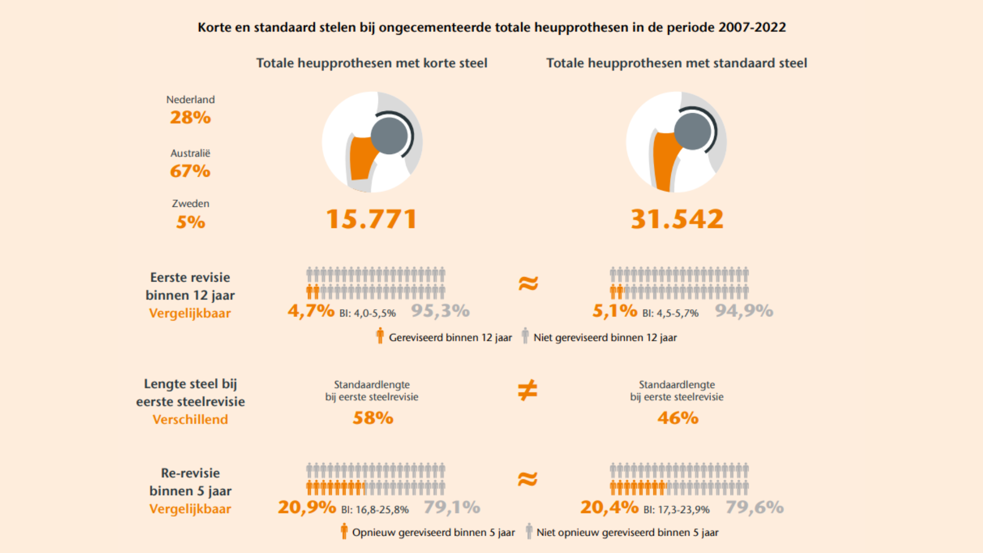 Er zijn geen verschillen in eerste revisie- en re-revisiepercentages tussen totale heupprothesen met een ongecementeerde korte steel en een standaard steel. Korte stelen lijken dus net zo goed te presteren als standaard stelen bij totale heupprothesen. Bij revisies van korte stelen kiezen orthopedisch chirurgen vaker voor een standaard steel dan voor een langere revisiesteel. Dit kan erop wijzen dat korte stelen een botbesparend effect hebben wanneer ze gereviseerd moeten worden. Om dit te bevestigen is verder onderzoek nodig.