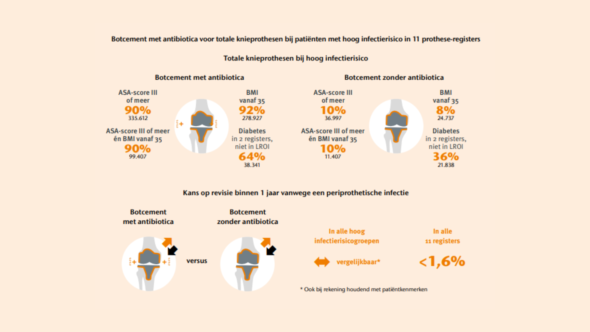 Bij patiënten met een verhoogd risico op infectie (ASA-score III of meer, BMI vanaf 35 of diabetes) lijkt het gebruik van botcement met antibiotica niet gepaard te gaan met een lager risico op revisie vanwege een periprothetische infectie. Klinische studies zijn nodig om te bepalen of botcement met antibiotica extra voordeel biedt.