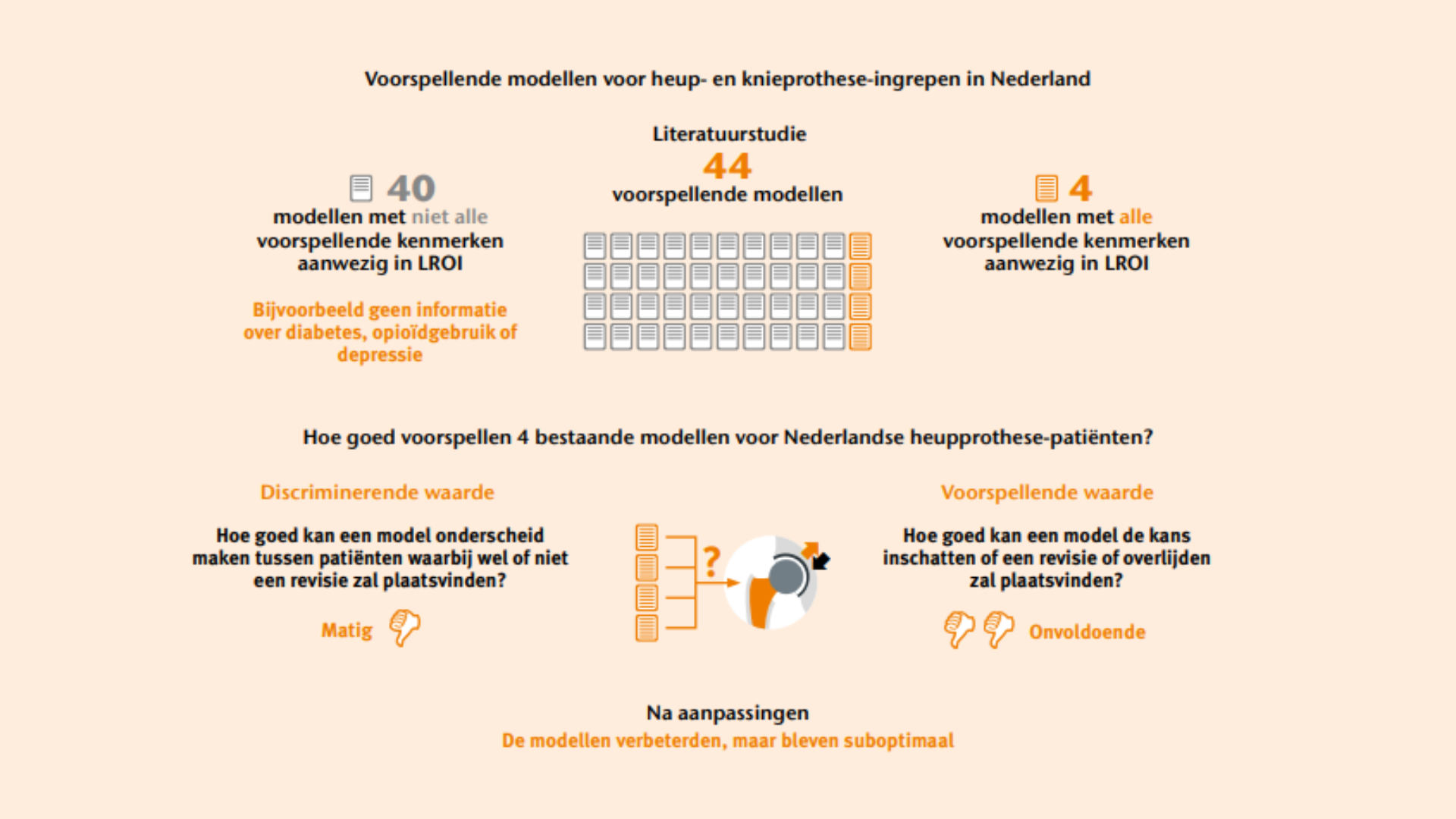 Gegevens uit registers, zoals de LROI, kunnen worden gebruikt voor externe validatie van voorspellende modellen. Dit is echter niet altijd mogelijk, omdat niet alle voorspellende kenmerken worden vastgelegd. De modellen die in deze studie zijn gevalideerd op de Nederlandse bevolking, presteerden niet optimaal. Ze konden niet met voldoende zekerheid inschatten of een revisie zal plaatsvinden bij een individuele patiënt. Dit benadrukt het belang van externe validatie voordat modellen worden gebruikt in een nieuwe populatie. Om de bruikbaarheid van registerdata voor de validatie van toekomstige voorspellende modellen te vergroten is het zinvol om relevante voorspellende kenmerken en uitkomsten, zoals diabetes, opioïdgebruik en depressie, in registraties op te nemen.