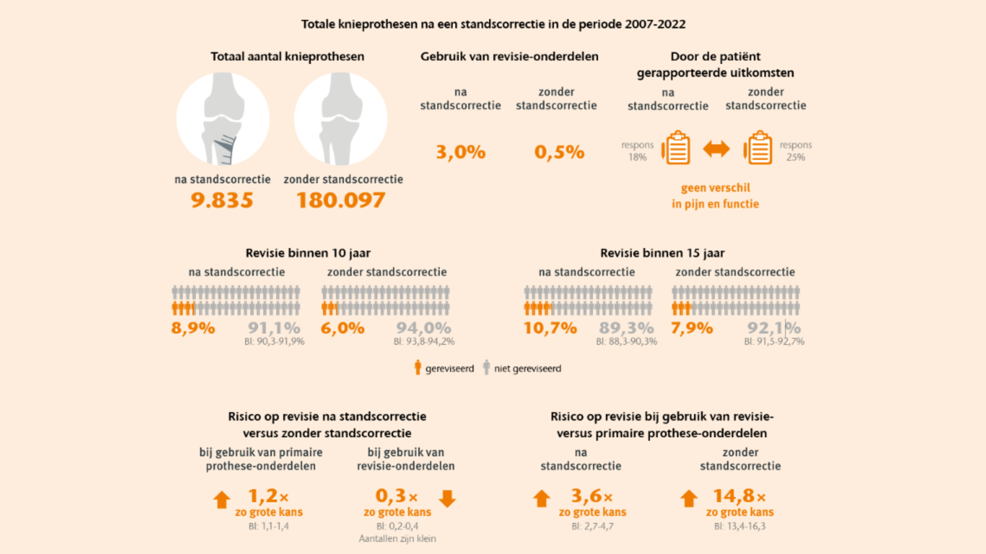 Bij een totale knieprothese na een eerdere standscorrectie zijn vaker revisie-onderdelen nodig dan bij een primaire knieprothese zonder standscorrectie. Ook gaat de knieprothese minder lang mee. Hierbij spelen de revisiecomponenten waarschijnlijk een belangrijke rol. Tot 1 jaar na de operatie zijn er bij de patiënten die vragenlijsten hebben ingevuld geen verschillen gevonden in pijn en functie. Ondanks de beperkingen van dit onderzoek is deze informatie waardevol voor jongere en actievere patiënten met artrose die mogelijk in aanmerking komen voor een standscorrectie.