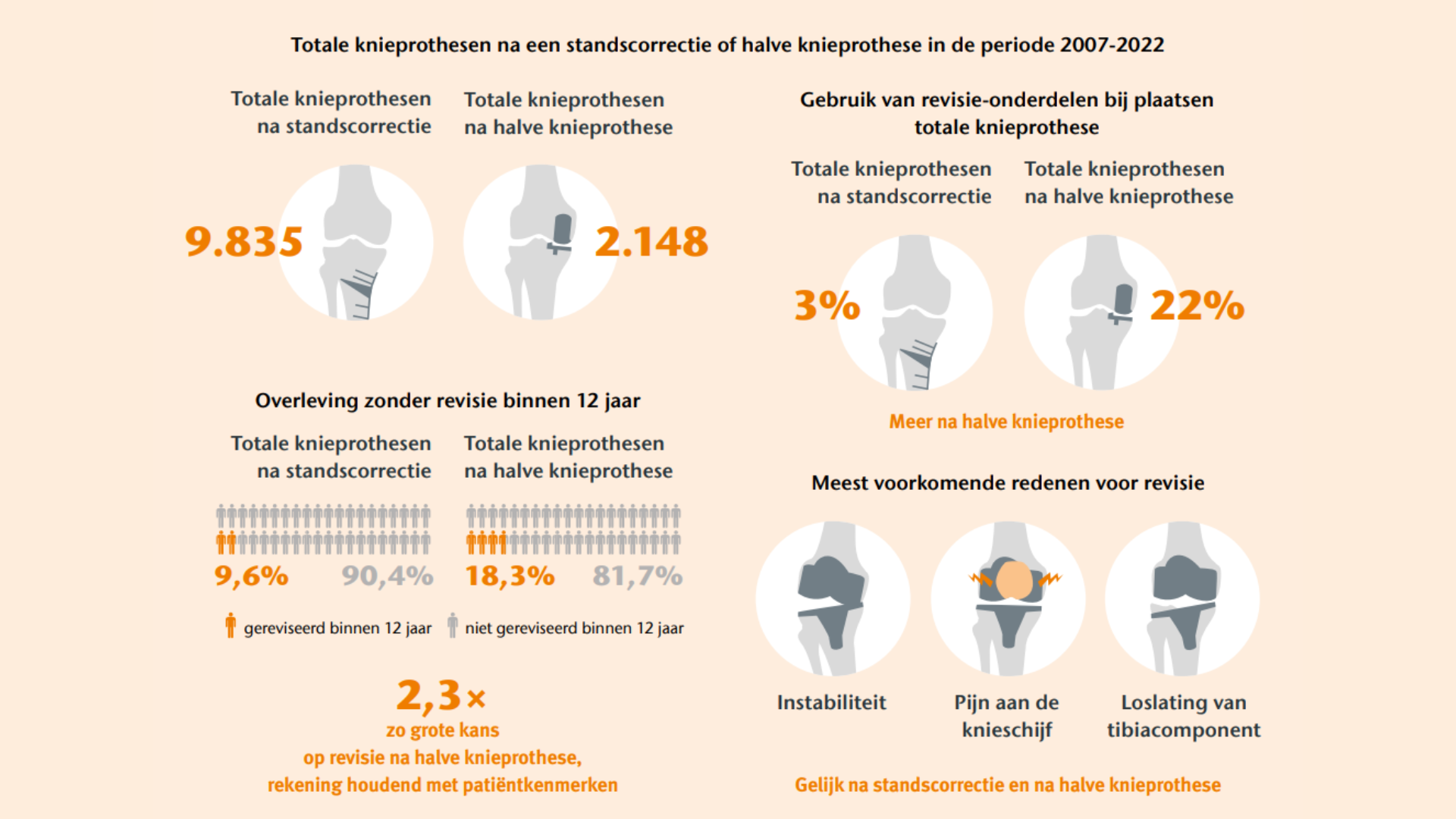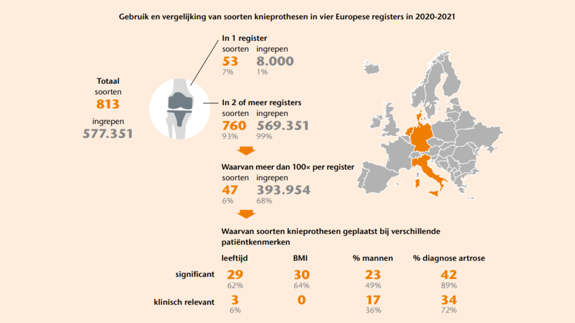 Veel knieprothesen komen in meerdere registers voor, waardoor gegevens gecombineerd zouden kunnen worden om problemen sneller te detecteren. Doordat deze prothesen vaak bij verschillende patiëntgroepen worden geplaatst, is een betrouwbare vergelijking van resultaten tussen registers echter lastig. Dit betekent dat resultaten over totale knieprothesen op basis van gecombineerde gegevens uit meerdere registers met voorzichtigheid moeten worden geïnterpreteerd.