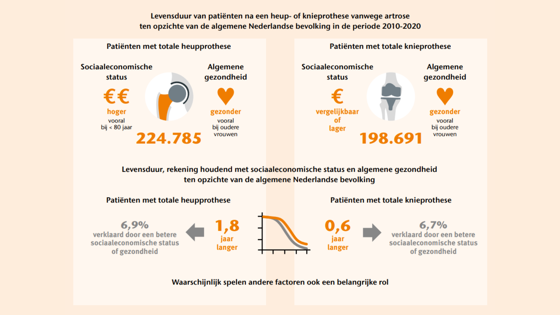 Dit onderzoek bevestigt dat Nederlandse mensen met artrose na een totale heup- of knieprothese gemiddeld langer leven dan de algemene bevolking. Sociaaleconomische status en algemene gezondheid dragen hieraan bij, maar verklaren slechts een klein deel van het verschil. Verder onderzoek naar onder andere leefstijl en beweging is nodig om meer inzicht te krijgen in hoeverre deze factoren meespelen. Het langer leven na een prothese wijst op verschillen tussen mensen die wel en geen operatie krijgen. De precieze oorzaak is onduidelijk, maar het is belangrijk dat zorgverleners de criteria voor het krijgen van een heup- of knieprothese kritisch bekijken.