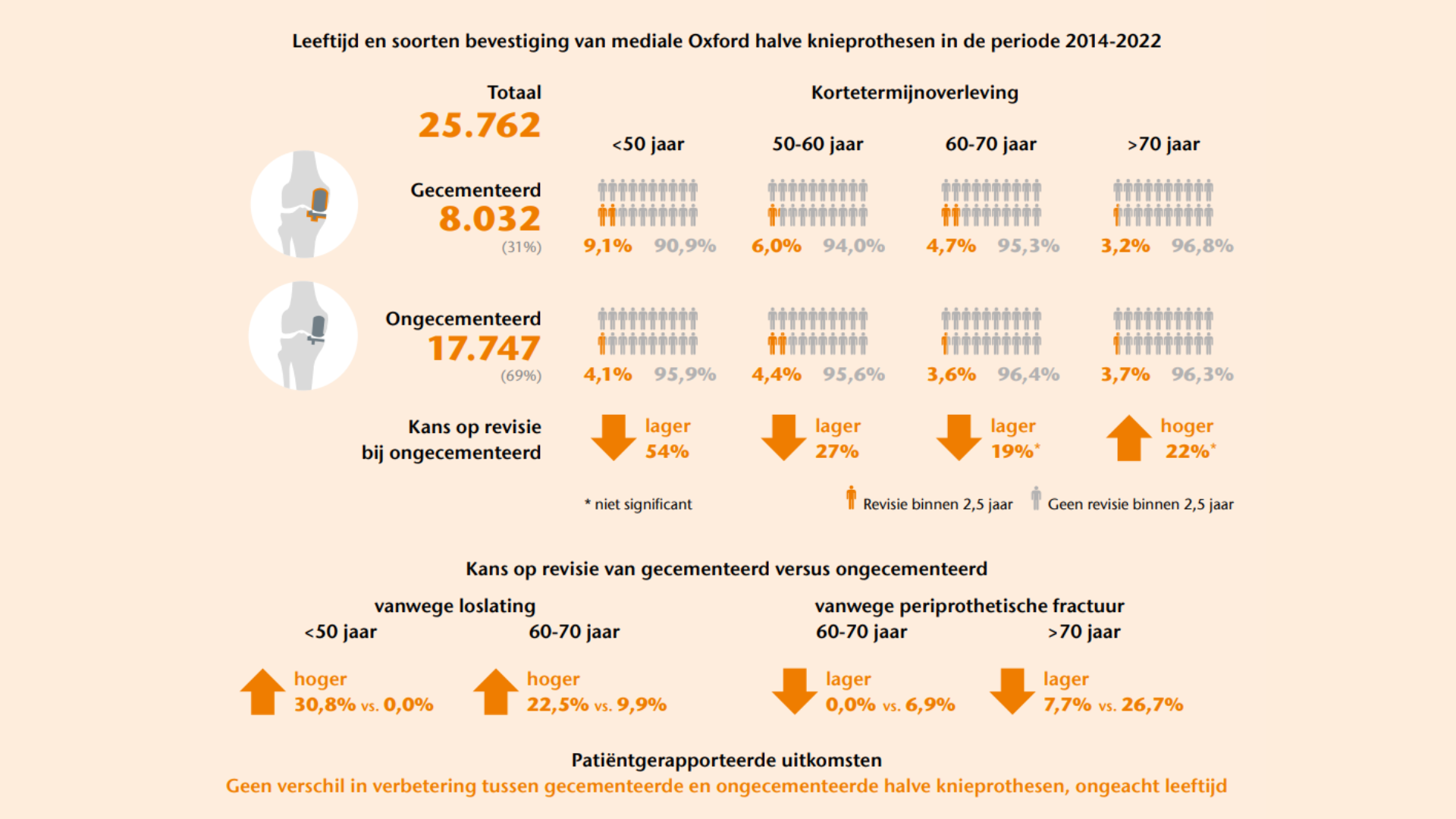 Ongecementeerde mediale Oxford halve knieprothesen hebben een betere kortetermijnoverleving dan gecementeerde mediale Oxford halve knieprothesen bij jongere patiënten. Daarnaast werden er leeftijdsgebonden verschillen gevonden in de redenen voor revisie: loslating kwam vooral voor bij gecementeerde bevestiging, terwijl periprothetische fracturen vaker voorkwamen bij oudere patiënten met een ongecementeerde halve knieprothese. Deze resultaten benadrukken het belang van het zorgvuldig overwegen van de leeftijd van de patiënt bij het kiezen van de meest geschikte soort bevestiging.