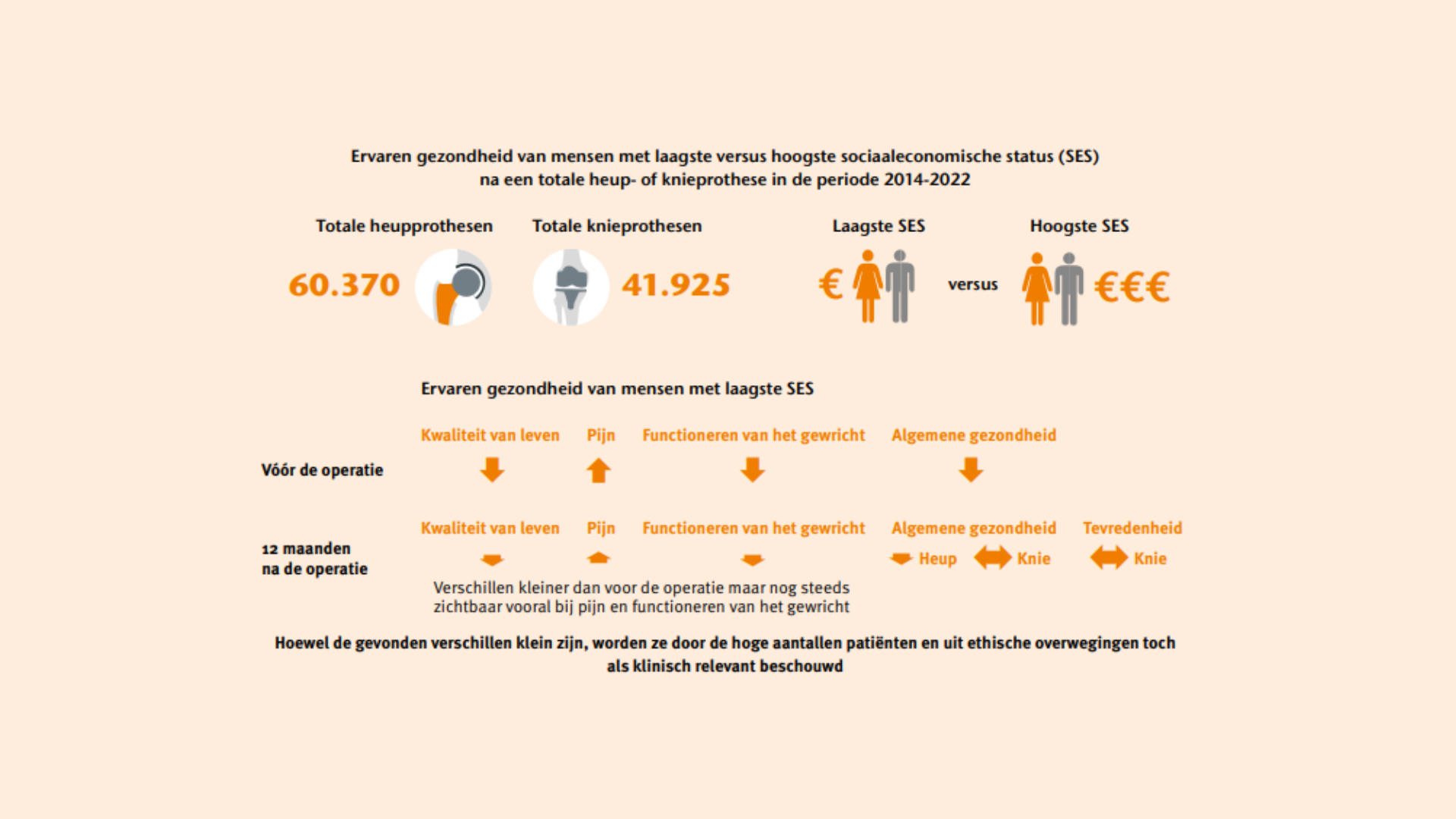 Mensen met een lagere sociaaleconomische status ervaren met name vóór, maar ook na een heup- of knieprothese een lagere kwaliteit van leven, meer pijn en slechter functioneren van het gewricht dan mensen met een hogere sociaaleconomische status. Dit zou bijvoorbeeld kunnen komen doordat ze later worden doorverwezen naar de orthopedisch chirurg of doordat er barrières zijn in de communicatie. Toch valt op dat deze patiënten hun algemene gezondheid niet veel slechter beoordelen en net zo tevreden zijn over het resultaat van de operatie. Mogelijk hebben zij andere verwachtingen van de behandeling. Al met al laten deze resultaten zien dat het belangrijk is om bij de zorg en begeleiding rekening te houden met sociaaleconomische verschillen.