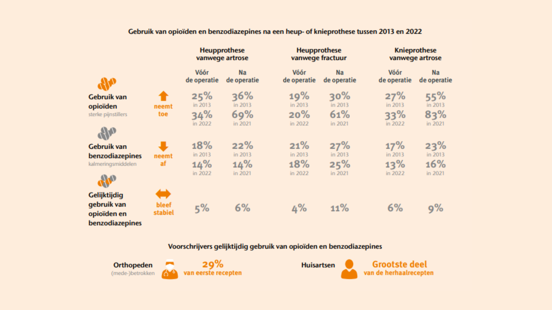 Tussen 2013 en 2022 is het gebruik van kalmeringsmiddelen (benzodiazepines) bij mensen met een heup- of knieprothese in Nederland afgenomen. Het gebruik van sterke pijnstillers (opioïden) is in diezelfde periode juist sterk toegenomen, zowel vóór als na de operatie. Ondanks waarschuwingen over de risico’s gebruikte tussen de 6 en 11 procent van de mensen beide middelen tegelijk. Huisartsen schreven deze medicijnen het vaakst voor, maar orthopeden waren medeverantwoordelijk voor ongeveer een derde van de voorschriften waarbij beide middelen tegelijk werden gebruikt in de eerste maanden na de operatie. Deze resultaten laten zien dat vooral het gebruik van opioïden nog steeds een belangrijk aandachtspunt is in de zorg rondom heup- en knieprothesen.